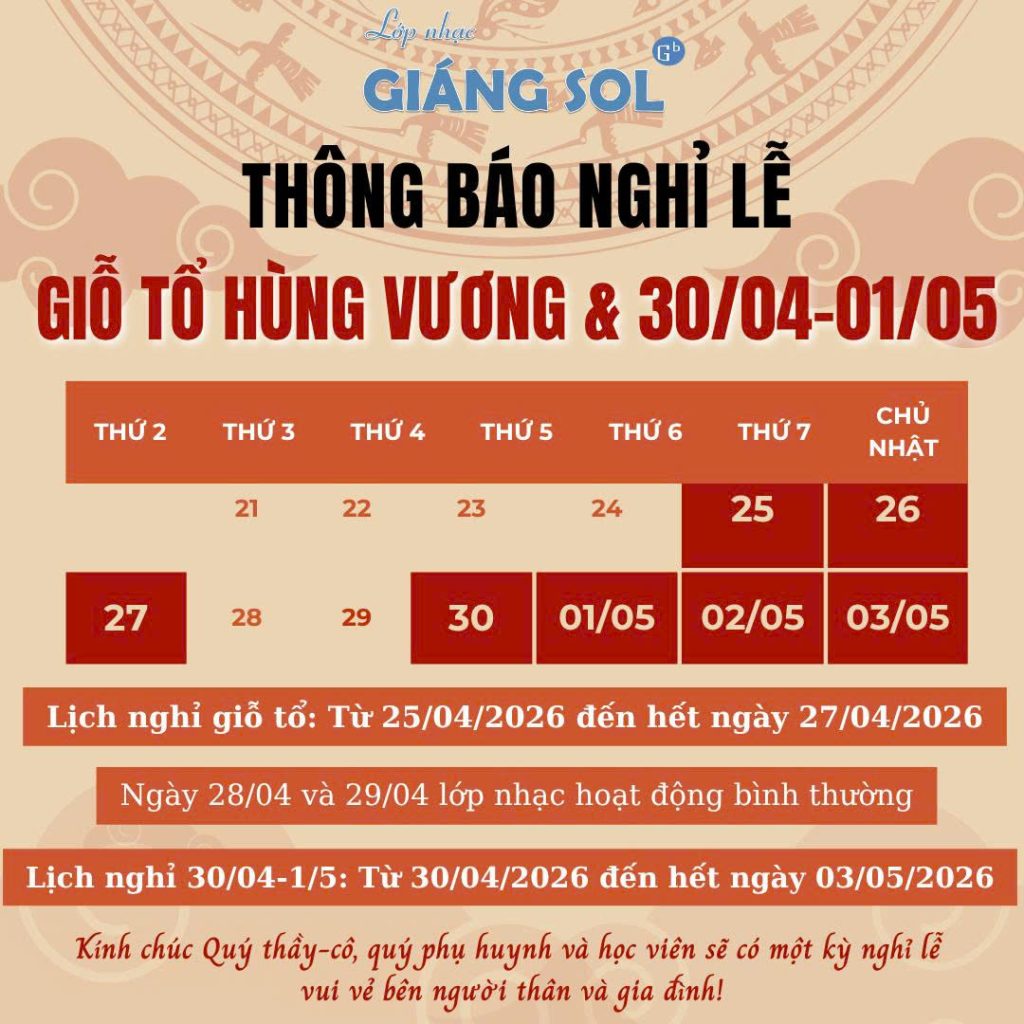 Lớp nhạc Giáng Sol xin thông báo đến Quý thầy cô, Quý phụ huynh và các học viên lịch nghỉ lễ cụ thể như sau: